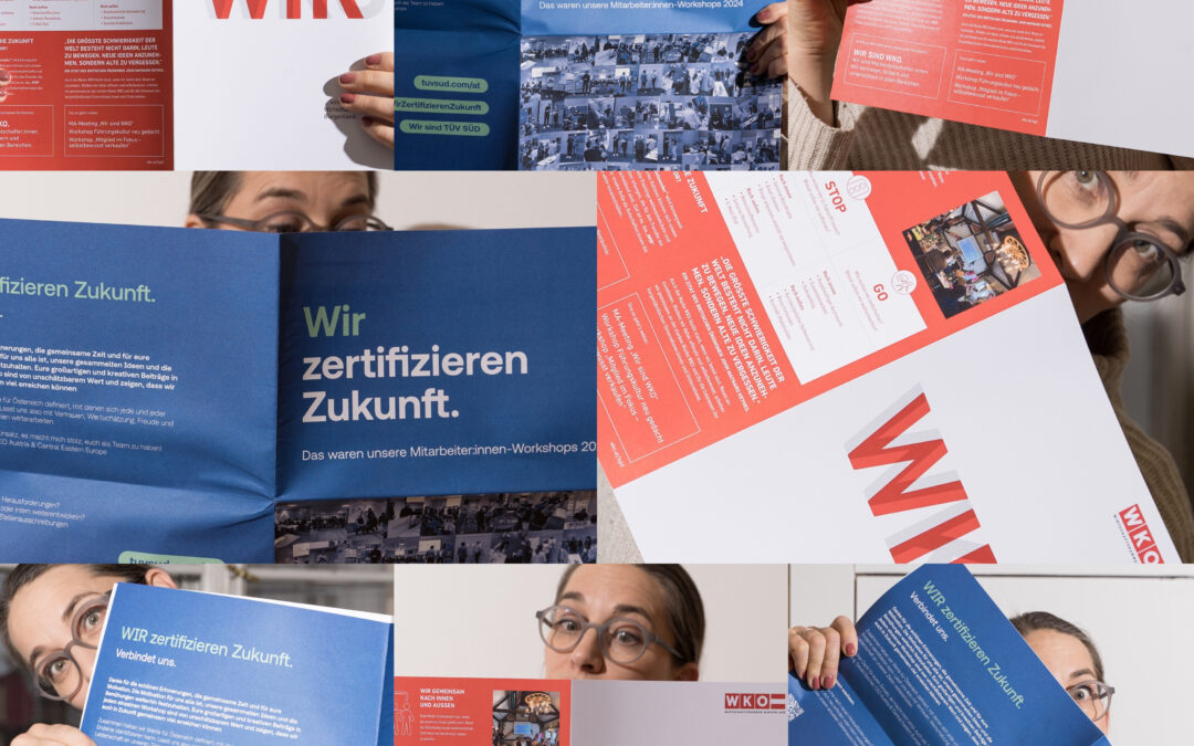 Um all das festzuhalten und an sämtliche Mitarbeiter:innen weiterzugeben, durften wir im vergangenen Jahr für unsere langjährigen Kunden TÜV SÜD und Wirtschaftskammer Burgenland Workshop-Zeitungen erarbeiten. Die individuellen Unterlagen fassen den Markenkern zusammen und liefern eine zuverlässige Anleitung.